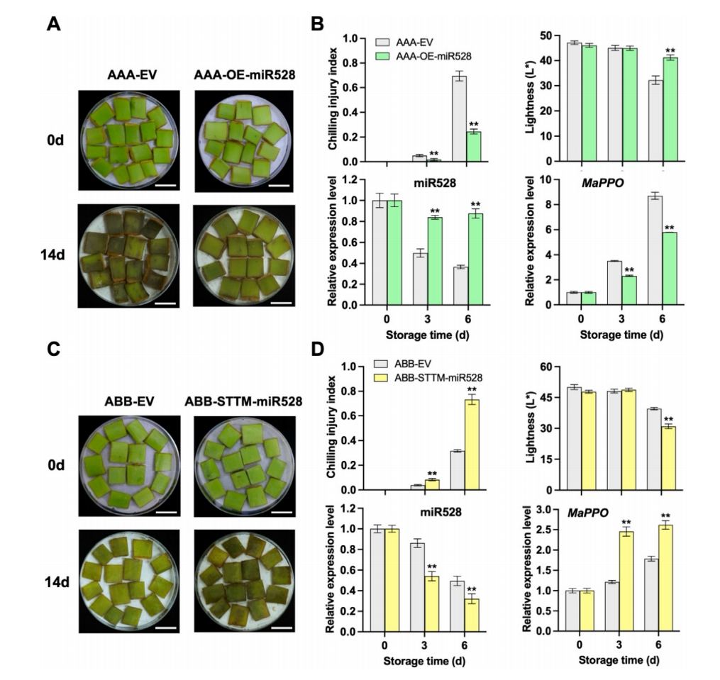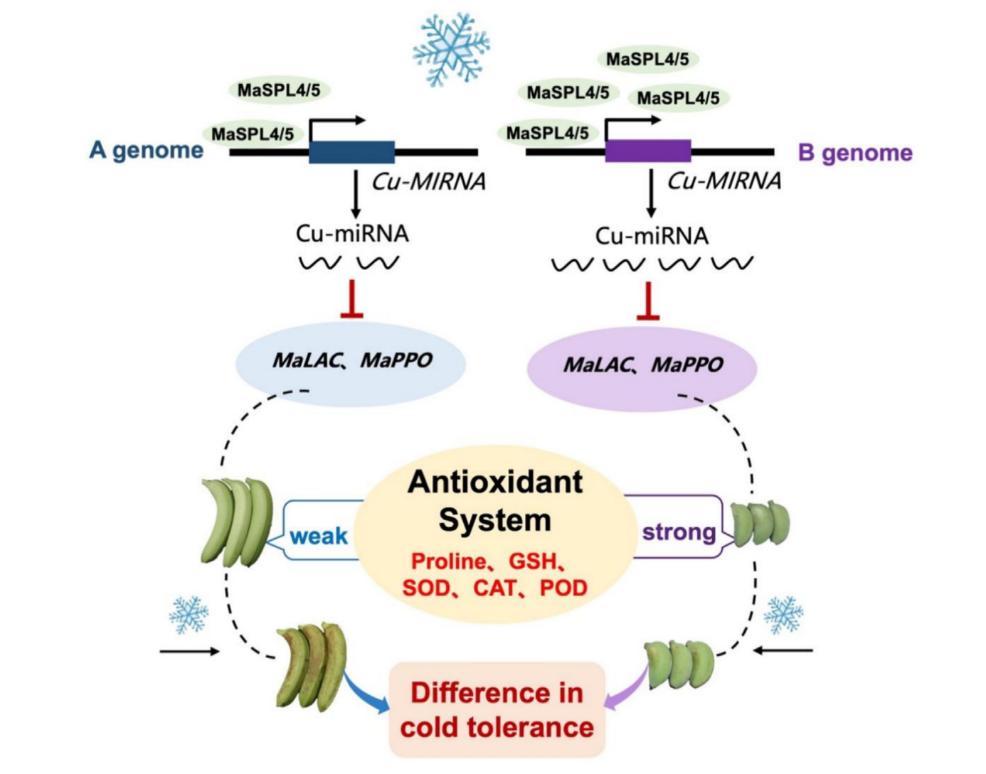 防控冷害是水果保鲜产业的技术难题,而果实冷害发生调控机制是采后生物学长期关注的前沿科学问题。香蕉是重要的果粮兼用作物,对许多热带和亚热带国家的粮食安全至关重要。作为典型的热带亚热带作物,香蕉对低温极为敏感,极易发生冷害,造成巨大的经济损失。一类在缺铜条件下上调表达的microRNA(被称为Cu-miRNA)大多靶向编码含铜蛋白的基因(如多酚氧化酶PPO、漆酶LAC、过氧化物酶POD等)。研究组前期研究发现,miR528-MaPPO模块在三倍体基因型AAA品种香蕉的冷害发生过程中起重要调控作用。然而,对于不同基因型背景的香蕉果实耐冷性差异的形成与Cu-miRNA调控之间是否存在联系,以及具体调控机制尚不明确。